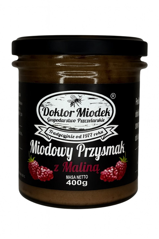 Miodowy Przysmak z Maliną od Doktora Miodka to unikalne połączenie naturalnego miodu i soczystych malin. Waga opakowania to 400 g. Idealny dla miłośników owocowych smaków oraz naturalnych produktów. Doskonale nadaje się do herbaty, deserów, naleśników i wypieków. Bez sztucznych dodatków i konserwantów. Wzbogacony o witaminy i minerały pochodzące z malin, wspiera odporność i działa antyoksydacyjnie.