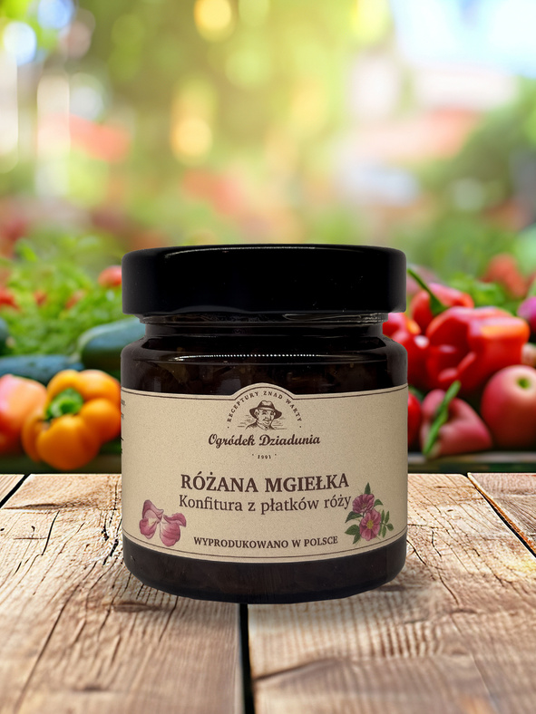 - Płatki róży w cukrze - Różana Rozkosz 240 g to naturalna konfitura z płatków róży, idealna do wypieków i deserów. Bez sztucznych dodatków, o intensywnym różanym aromacie.